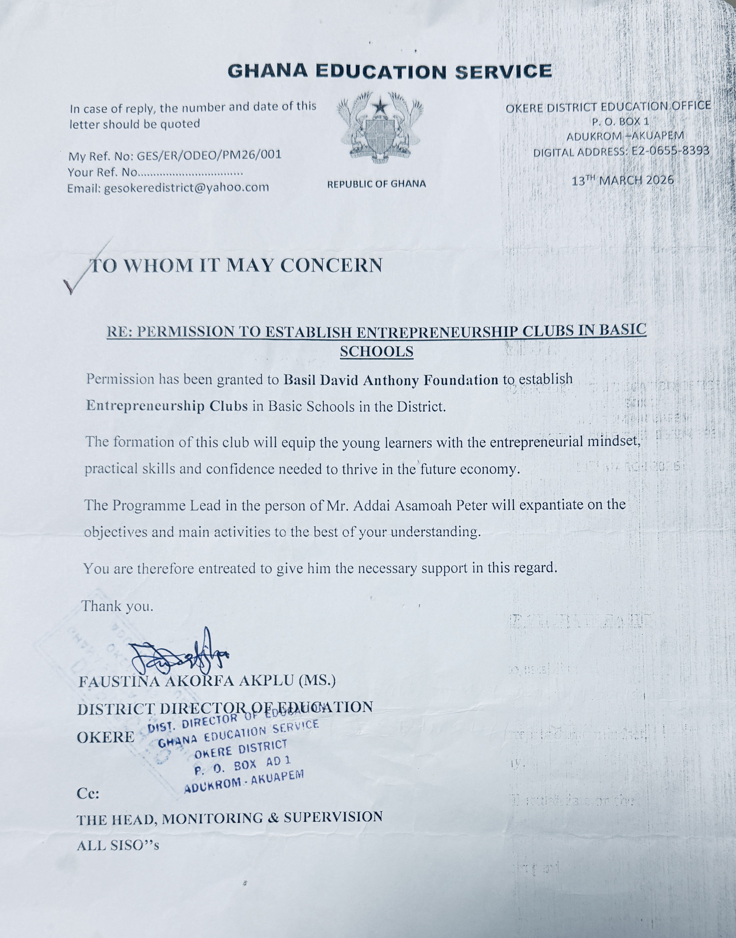 The Basil David Anthony Foundation is proud to announce that it has officially received approval from the Ghana Education Service (GES), Okere District, to establish Studentpreneurship & Enterprise Development (SEED) Clubs in basic schools across the district.