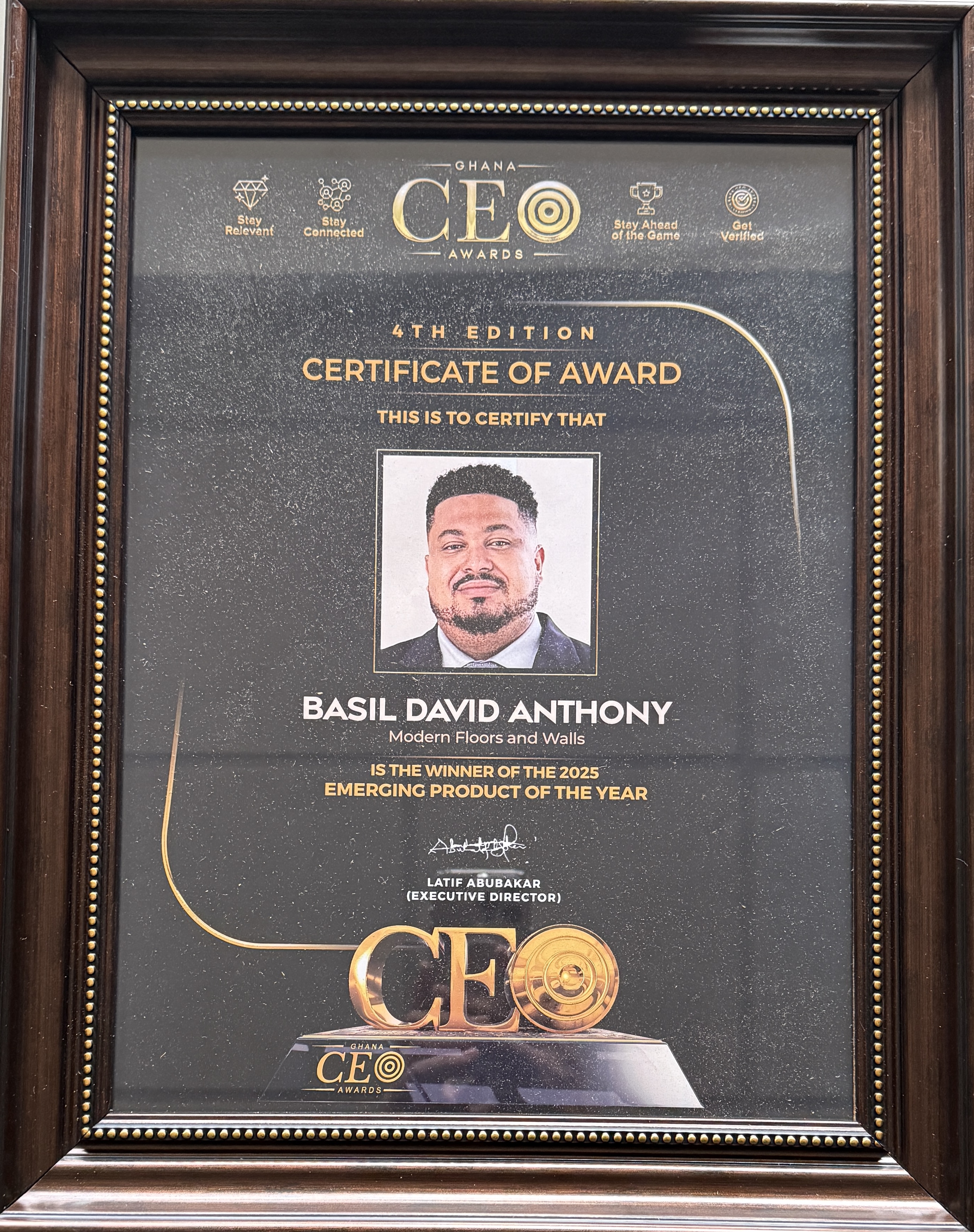 In April 2024 Modern Floors Ghana CEO Basil David Anthony scooped the 2024 Forty under 40 Africa Award in the Home & Décor Category held in Nairobi, Kenya;
